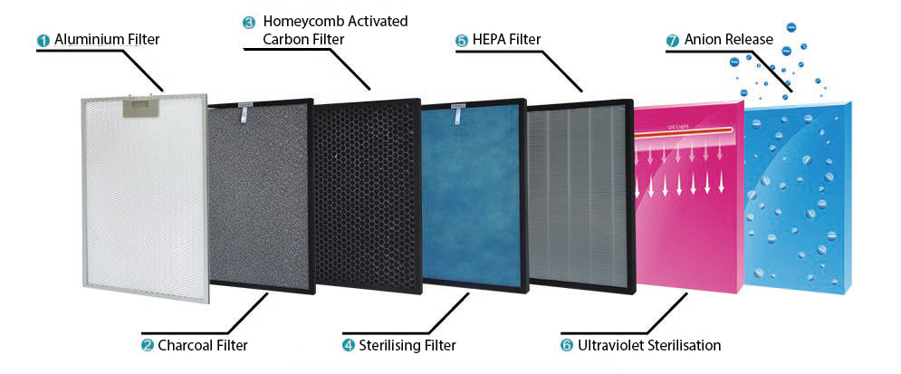 It features a multi-layer filtration system including a HEPA filter, activated carbon filter, and pre-filter. This combination captures fine dust, allergens, odours, and volatile organic compounds (VOCs).