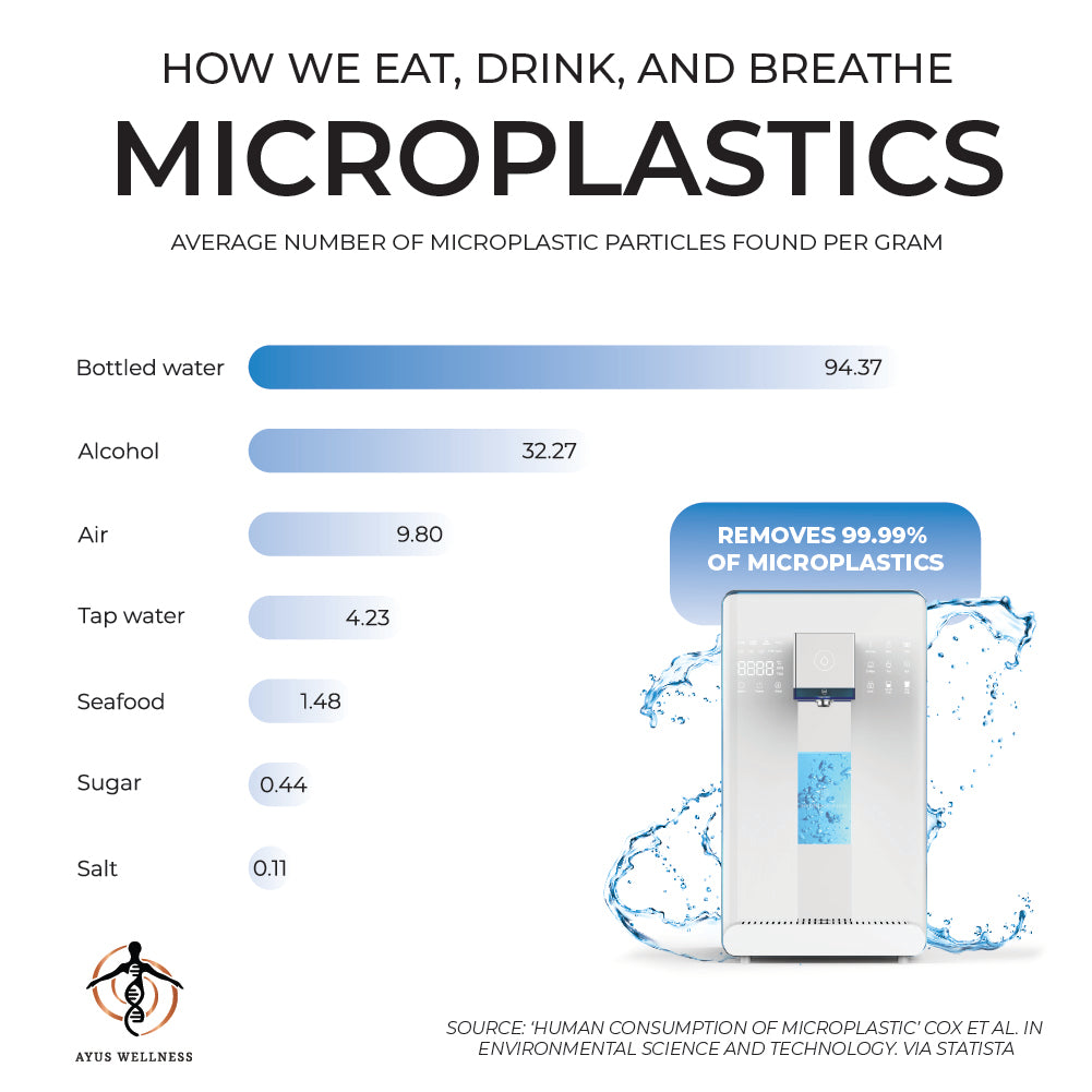 The Ayus Wellness Reverse Osmosis Hydrogen+ Water Purifier removes 99.99% of contaminants from the source water, including microplastics and PFAS. Ensuring your family is drinking clean, crisp, and delicious water.