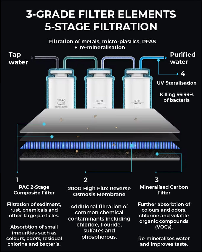 Our system is rigorously tested and certified to meet the highest standards of quality and safety. It's backed by a reliable warranty, offering you peace of mind and long-lasting performance. With antimicrobial UV sterilisation light, ensuring that there is no bacterial contamination as this is a common concern with standard RO systems.